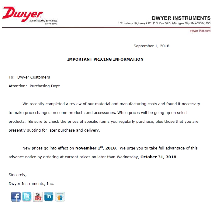由於美國DWYER原廠每年皆會針對所有產品調漲價格,