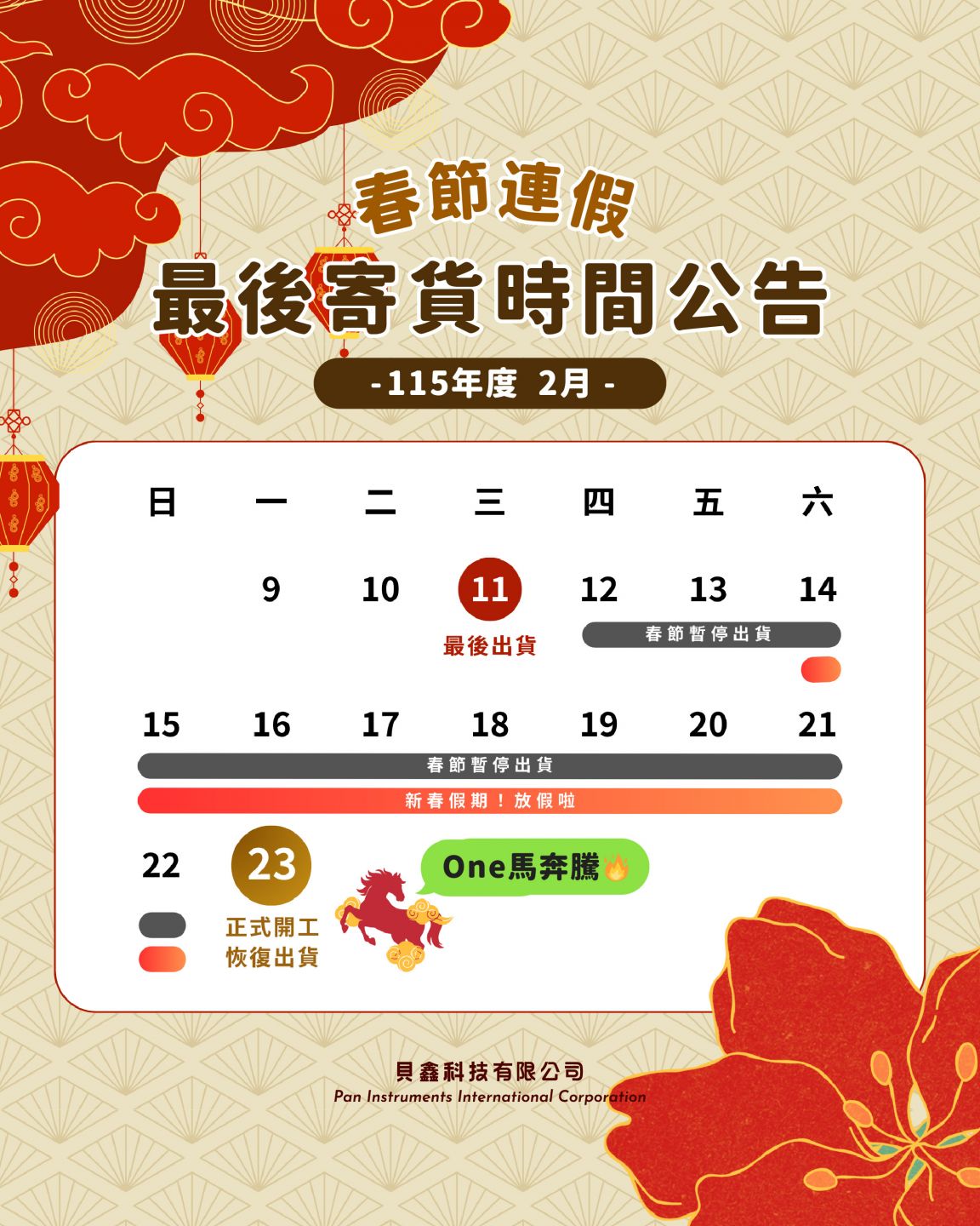 因應年節前貨運量龐大,我們最後寄貨時間為 2/11(週三)之後則暫停出貨寄貨!且將於2/23(週一)依序恢復出貨,感謝您的耐心等待!
