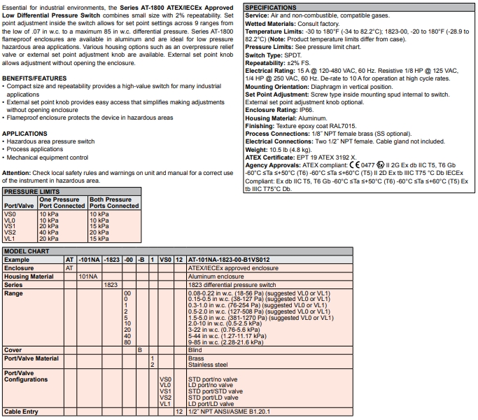 SERIES AT-1800 ATEX/IECEX APPROVED LOW DIFFERENTIAL PRESSURE SWITCH