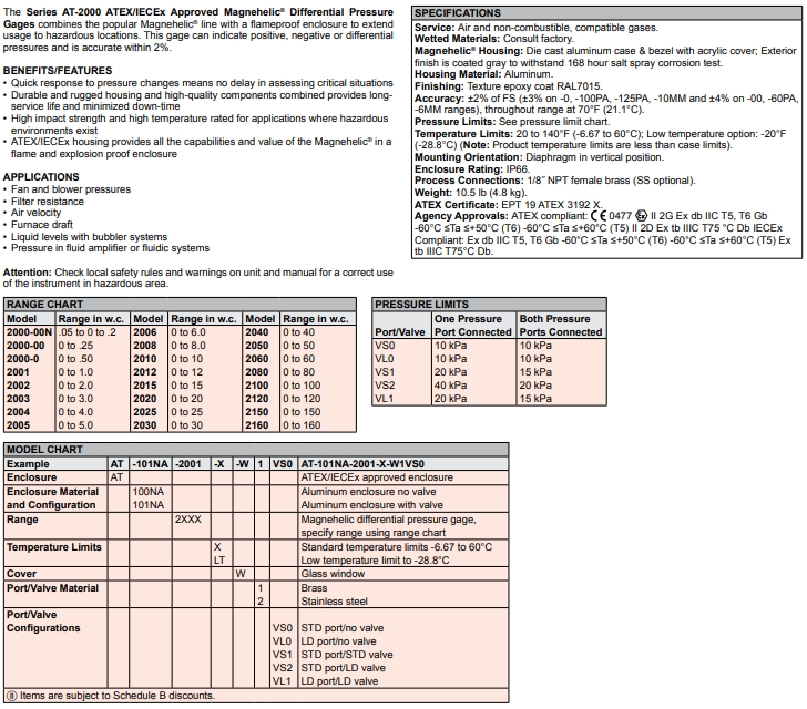 SERIES AT-2000 ATEX/IECEX APPROVED MAGNEHELIC® DIFFERENTIAL PRESSURE GAGES