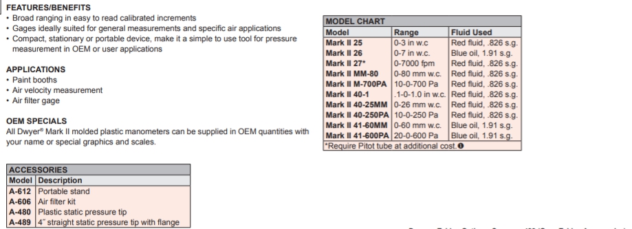Series Mark II. Molded Plastic Manometer. 3% Accuracy for Stationary and Portable Applications at Minimum Cost