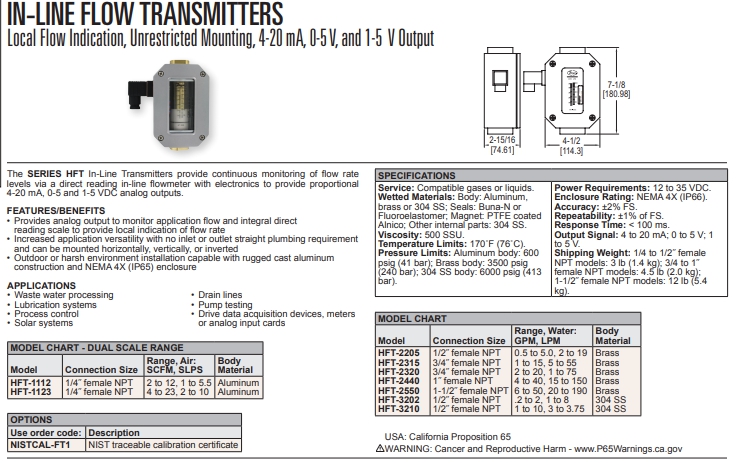 Series HFTIn-Line Flow Transmitter. Local Flow Indication, Unrestricted Mounting, 4-20 mA, 0-5 V, and 1-5 V Output
