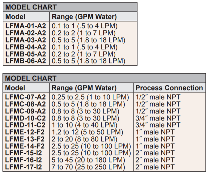 The SERIES LFM Polycarbonate Flowmeters are made of precision, injection molded polycarbonate bodies and fittings. This series consists of LFMA, LFMB, LFMC, LFMD, LFME and LFMF flowmeters with 3" (76 mm), 6" (152 mm), 5" (127 mm), 6" (152 mm), 8" (203 mm) and 11" (279 mm) respective scales. They feature dual, direct reading scales measuring in both GPM and LPM.CAUTION: Series LFM Flowmeters are for indoor use only or areas without direct sunlight. Polycarbonate is adversely affected by ultraviolet light.