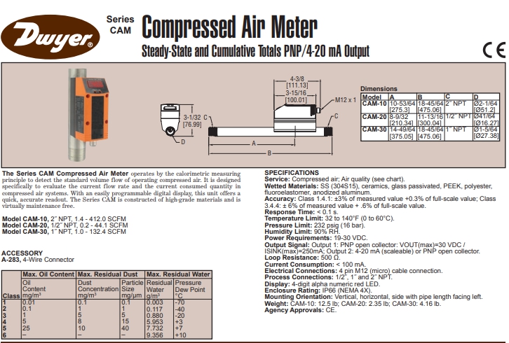 Series CAM Compressed Air MeterSteady-State and Cumulative Totals PNP/4-20 mA Output