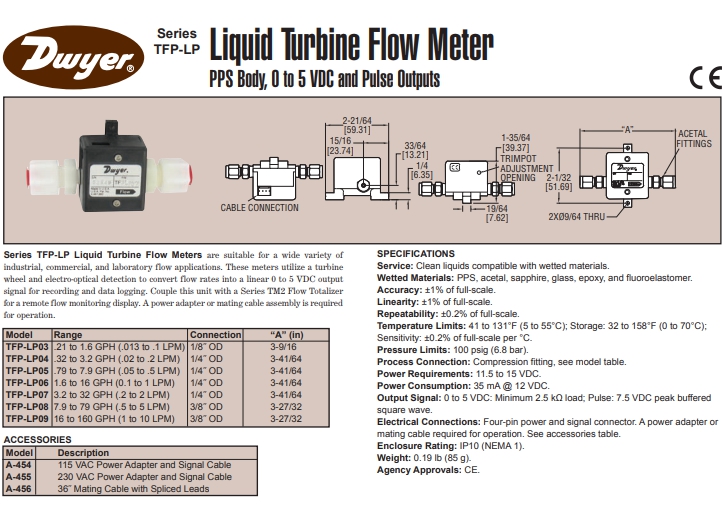 Series TFP-LP Liquid Turbine Flow Meter PPS Body, 0 to 5 VDC and Pulse Outputs