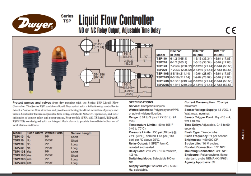 Series TSP Liquid Flow Controller. NO or NC Relay Output, Adjustable Time Delay