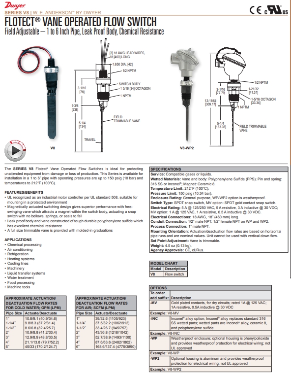 Series V8 Flotect® Vane Operated Flow Switch. Field Adjustable – 1 to 6 Inch Pipe, Leak Proof Body, Chemical Resistance