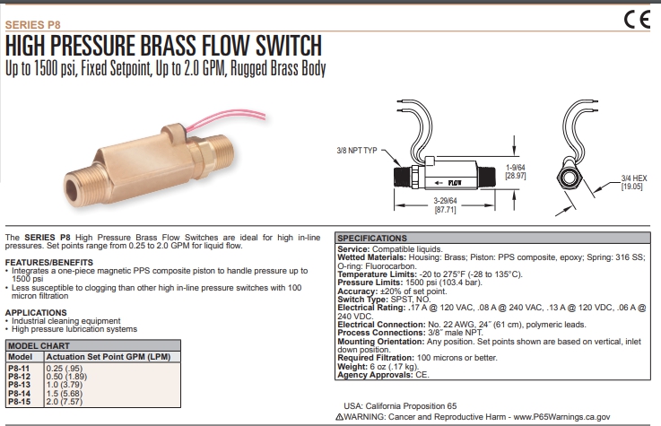 Series P8. High Pressure Brass Flow Switch. Up to 1500 psi, Fixed Set point, Up to 2.0 GPM, Rugged Brass Body