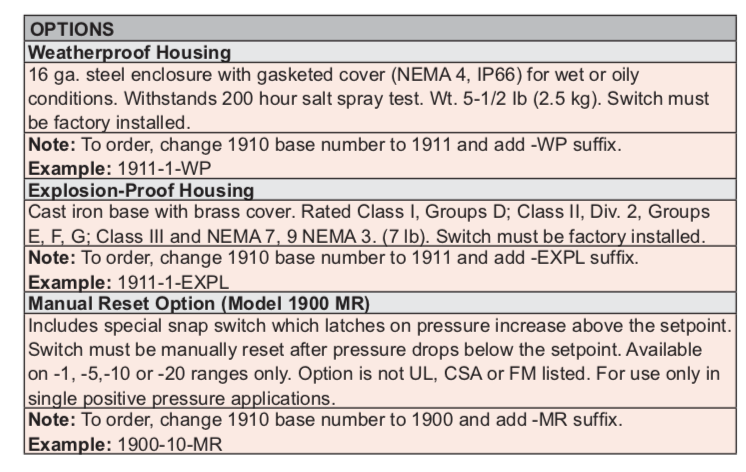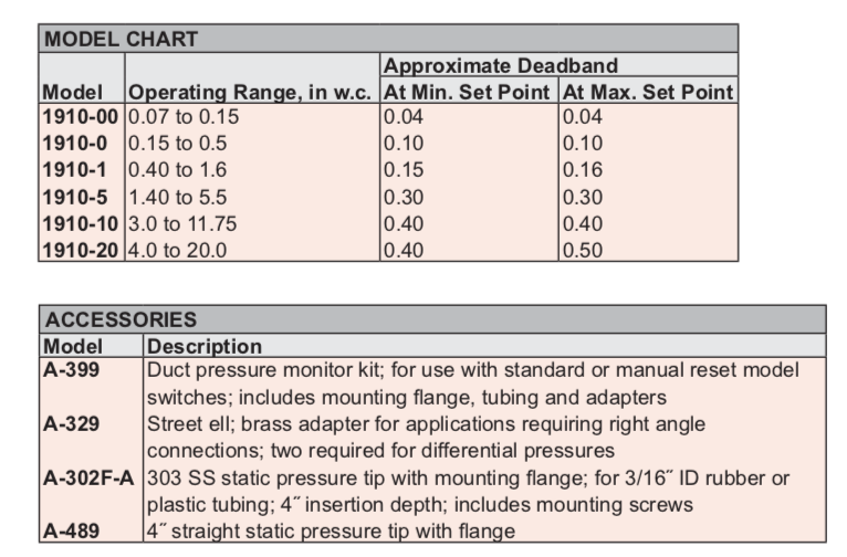 Series 1900 Compact Low Differential Pressure Switches. Set Points from 0.07" to 20" w.c., Repetitive Accuracy within 3%