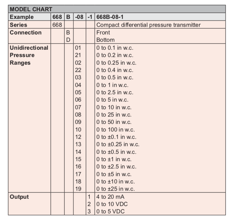 Series 668B/D Compact Differential Pressure Transmitters. Ranges from 0.1 to 100 in w.c., Overpressure Protection to 15 psig, ±0.8% Accuracy