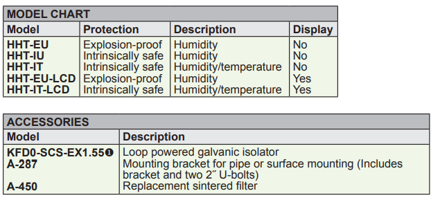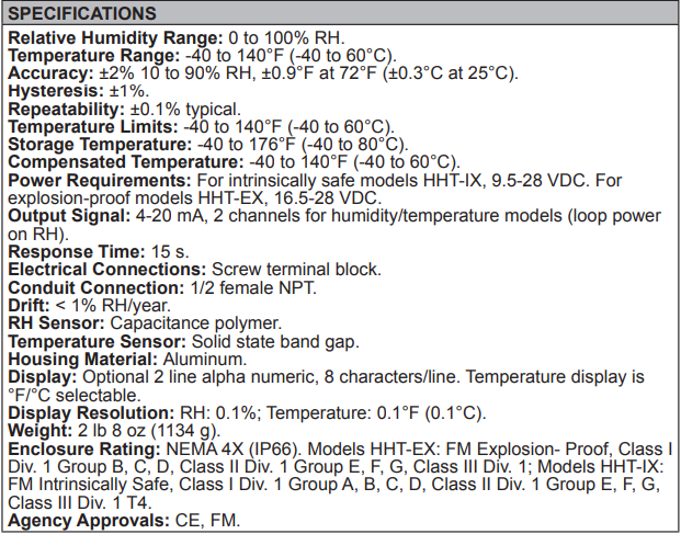 The Series HHT humidity/temperature transmitter is excellent for offshore HVAC applications, dust and grain applications. Intrinsically safe models require an intrinsically safe barrier.