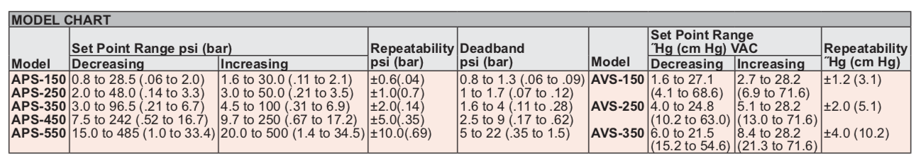 Series APS/AVS Adjustable Pressure Switch. Vacuum and Pressure Ranges, 5 A Switch, Compact Size
