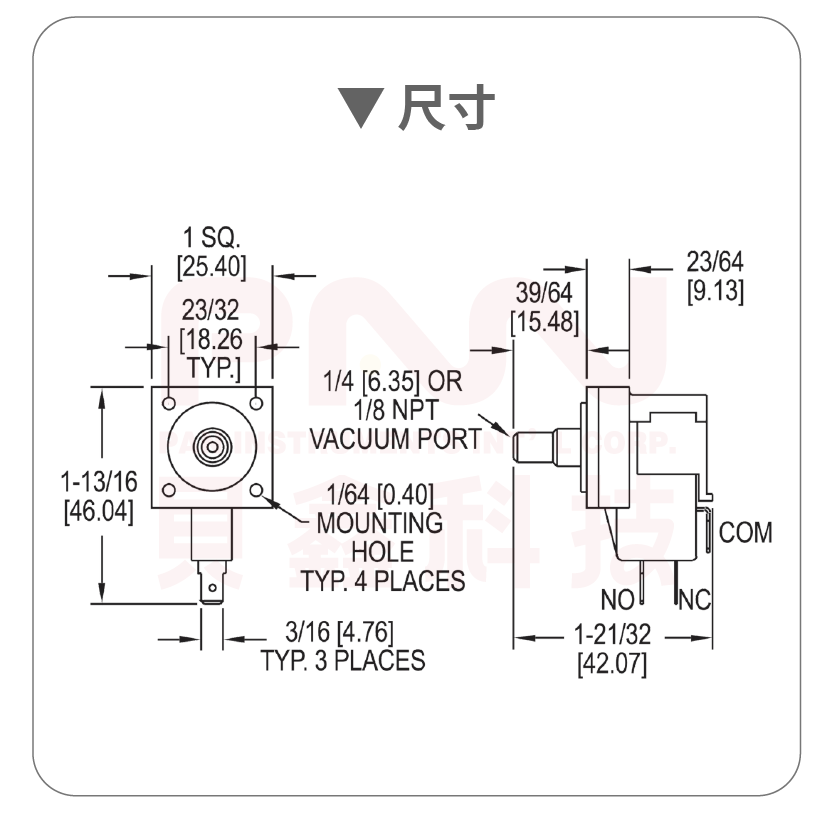 美國 Dwyer MVS 系列 微壓/微型真空壓力開關,專為真空吸盤檢知、真空泵保護與 OEM 自動化設備設計。體積輕巧、反應靈敏。貝鑫科技 (Dwyer台灣唯一總代理) 提供專業選型建議與原廠技術支援。Series MVS. Miniature Vacuum Switch. SPDT N/O or N/C Switch, Adjustable Set Point, Ideal for OEM's