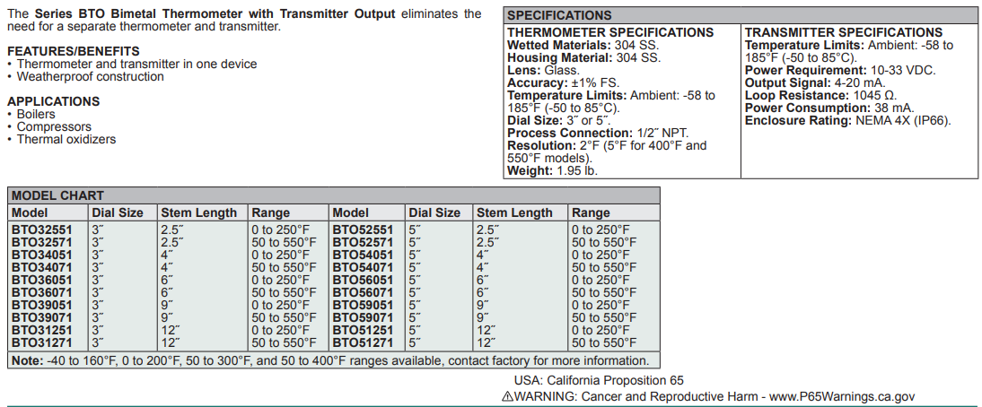 The Series BTO Bimetal Thermometer with Transmitter Output eliminates the need for a separate thermometer and transmitter. By only needing one connection, the BTO series reduces installation cost and saves space. The head-mount transmitter is located in a weatherproof thermal head located on the side of the stem. The BTO series is ideal for use on power generating boilers, skid mounted compressors, and thermal oxidation systems.