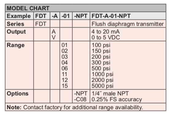 Series FDT Flush Diaphragm Transmitter. Non-liquid Filled, ±0.5% F.S.O. Accuracy, SS Wetted Parts
