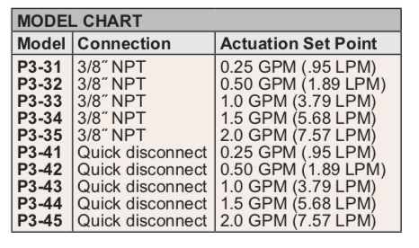 Series P3 Polypropylene Flow Switch. Fixed Set Points from 0.25 to 2.0 GPM, 3/8" NPT or "Quick Disconnect" Adapters