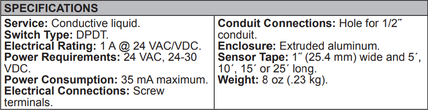 Series WD Water Detector and Sensor TapeDetects Low Levels Of Conductive Liquids, Large Measuring Area