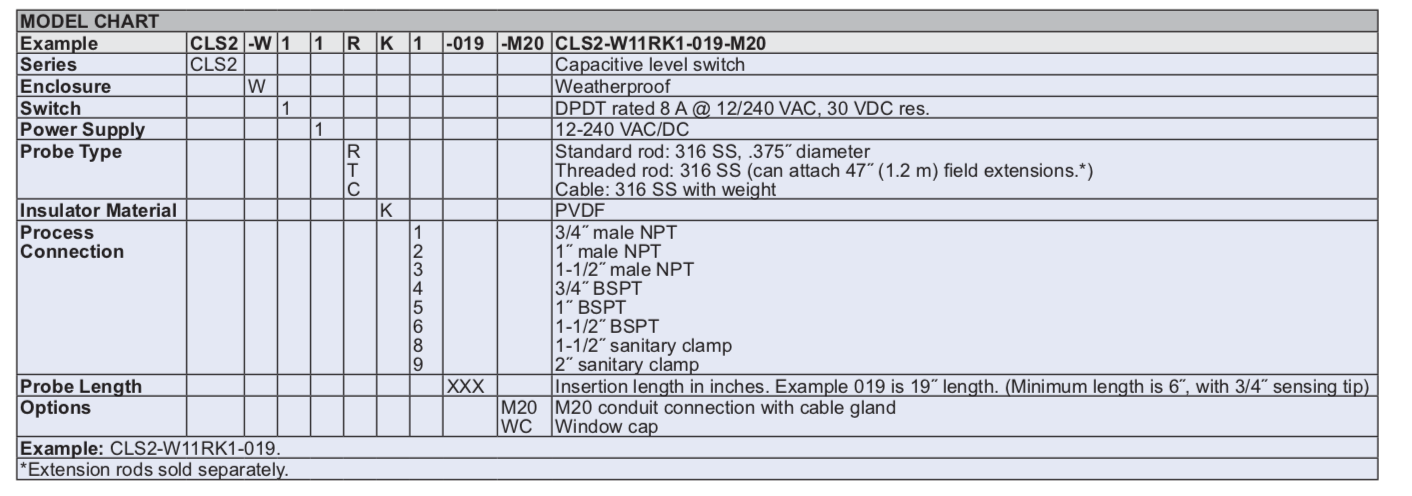 Series CLS2 Capacitive Level Switch. Powder, Bulk, or Liquids, Auto-Calibration