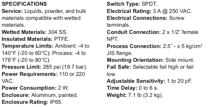 Model FCLS Flush Capacitance Level Switch. Maintenance Free, Economical, Flush Mounting