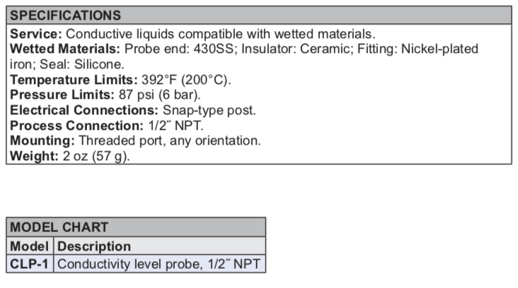 Series CLP Conductivity Level Probe. Low Cost, Compact Design