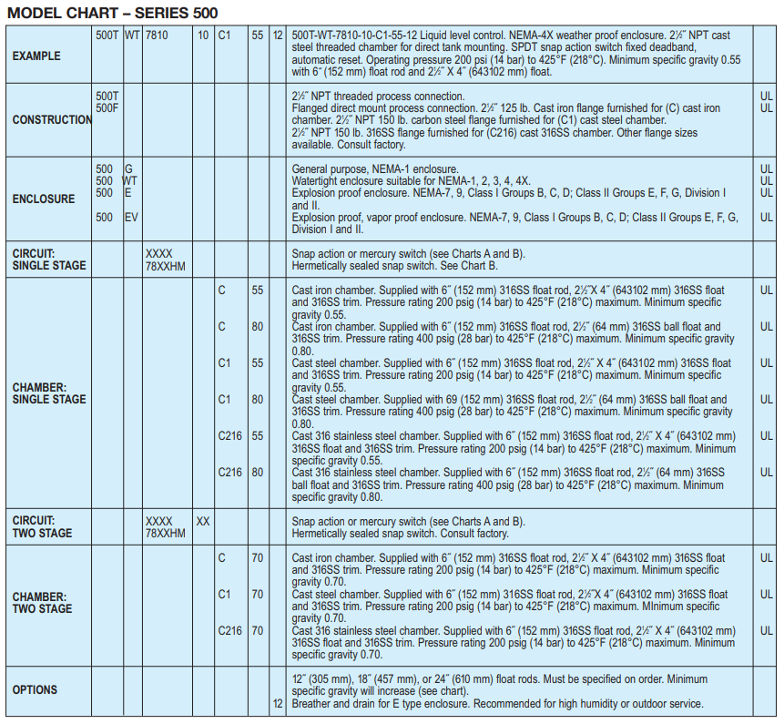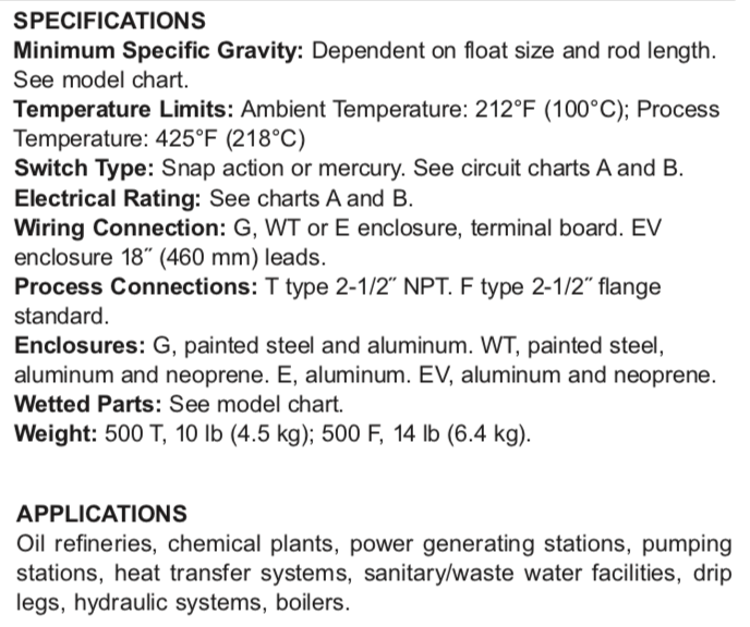 Series 500 Insertion Type Level ControlAdjustable Deadband, Weatherproof Enclosure