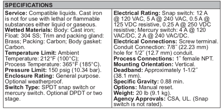 Series 123/125 Boiler Water Level ControlHeavy Duty, Cast Iron Chamber