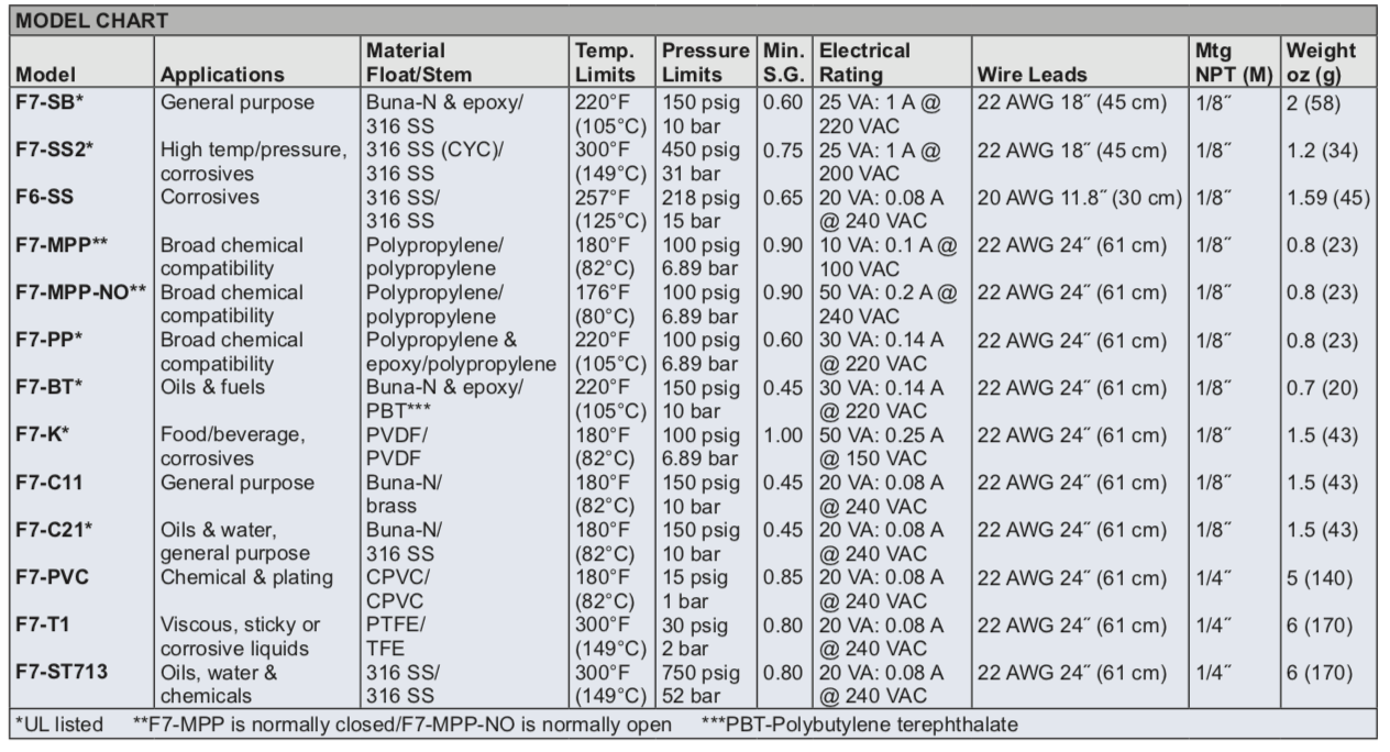 Series F6 & F7 Level Switches - Vertical. Low Cost, Reliable and Compact, Hermetically Sealed Contacts