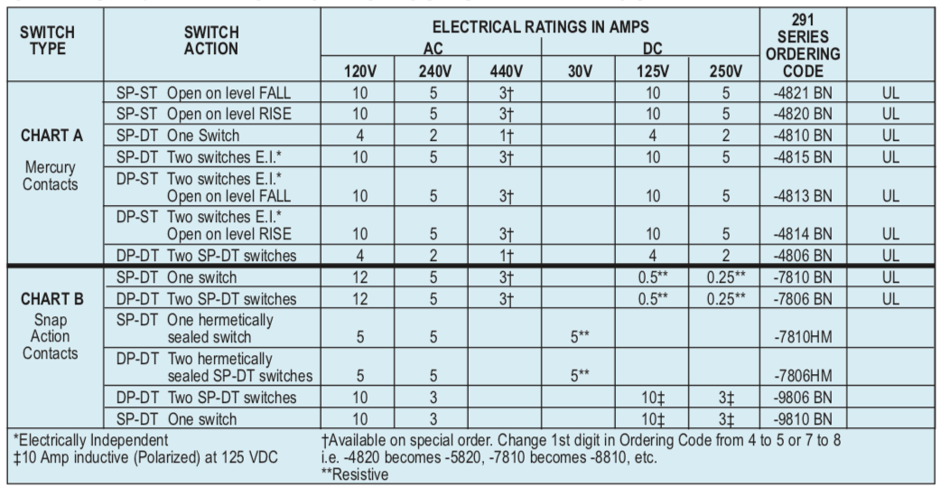 Series 291/293/294 Welded Chamber Level ControlSingle Stage, Low Cost, Hermetically Sealed Snap Switches