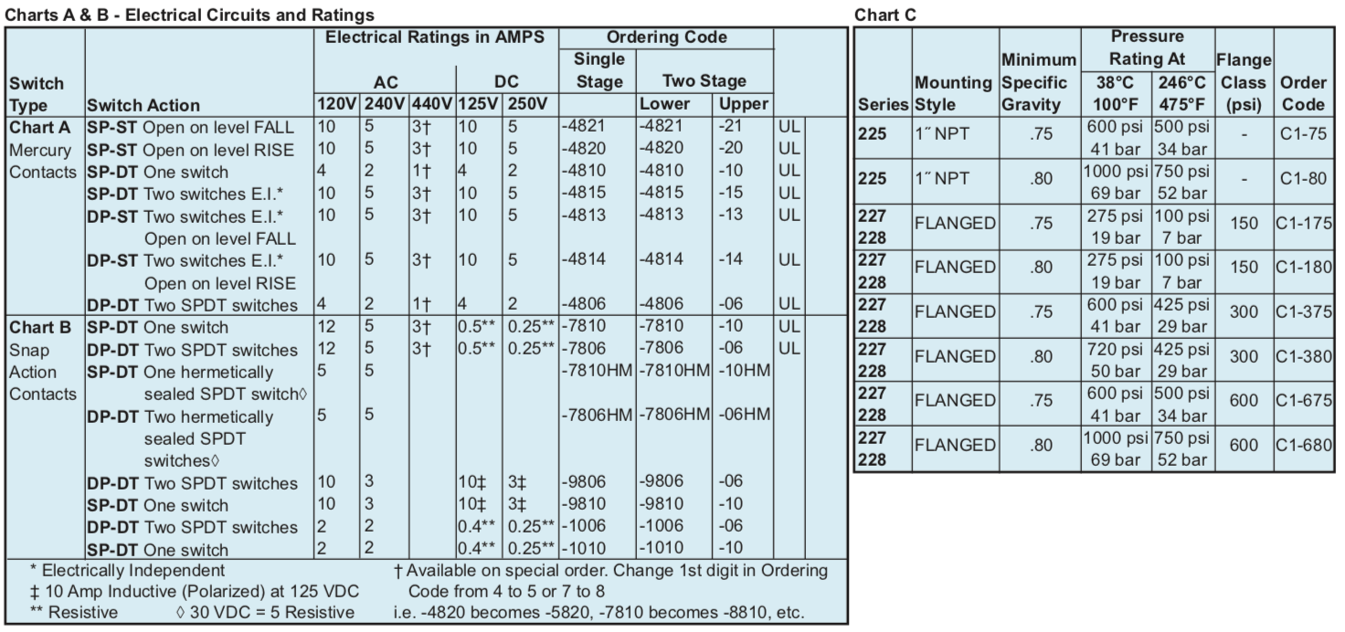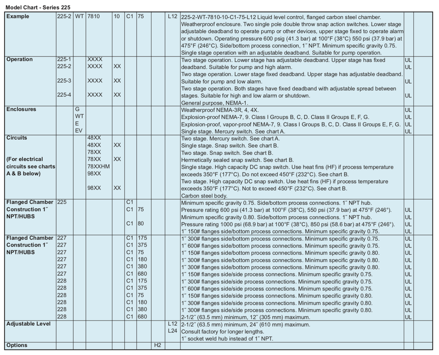 Series 225/227/228 Flanged ChamberAdjustable Deadband 12" to 24", Pressure to 1000 psig (68.9 bar), Temperature to 475°F (246°C), Hermetically Sealed Switches