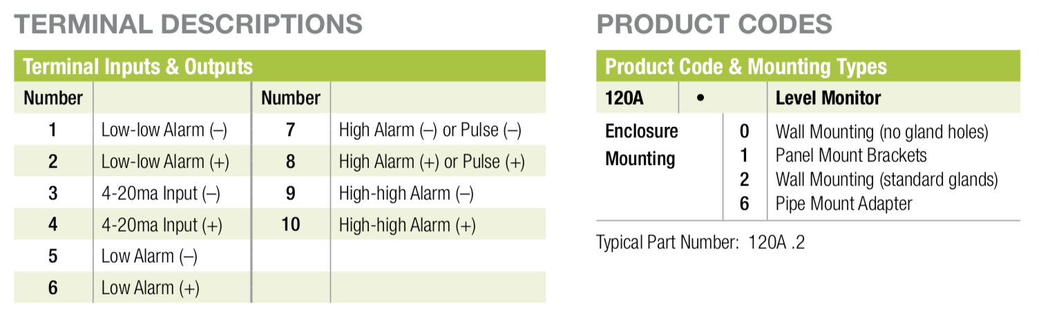 The Model 120 Level Monitor accepts a 4-20mA signal from a wide range of level sensors, including pressure transmitters, ultrasonic sensors or capacitance probes, and displays both level and tank contents on a large LCD display.