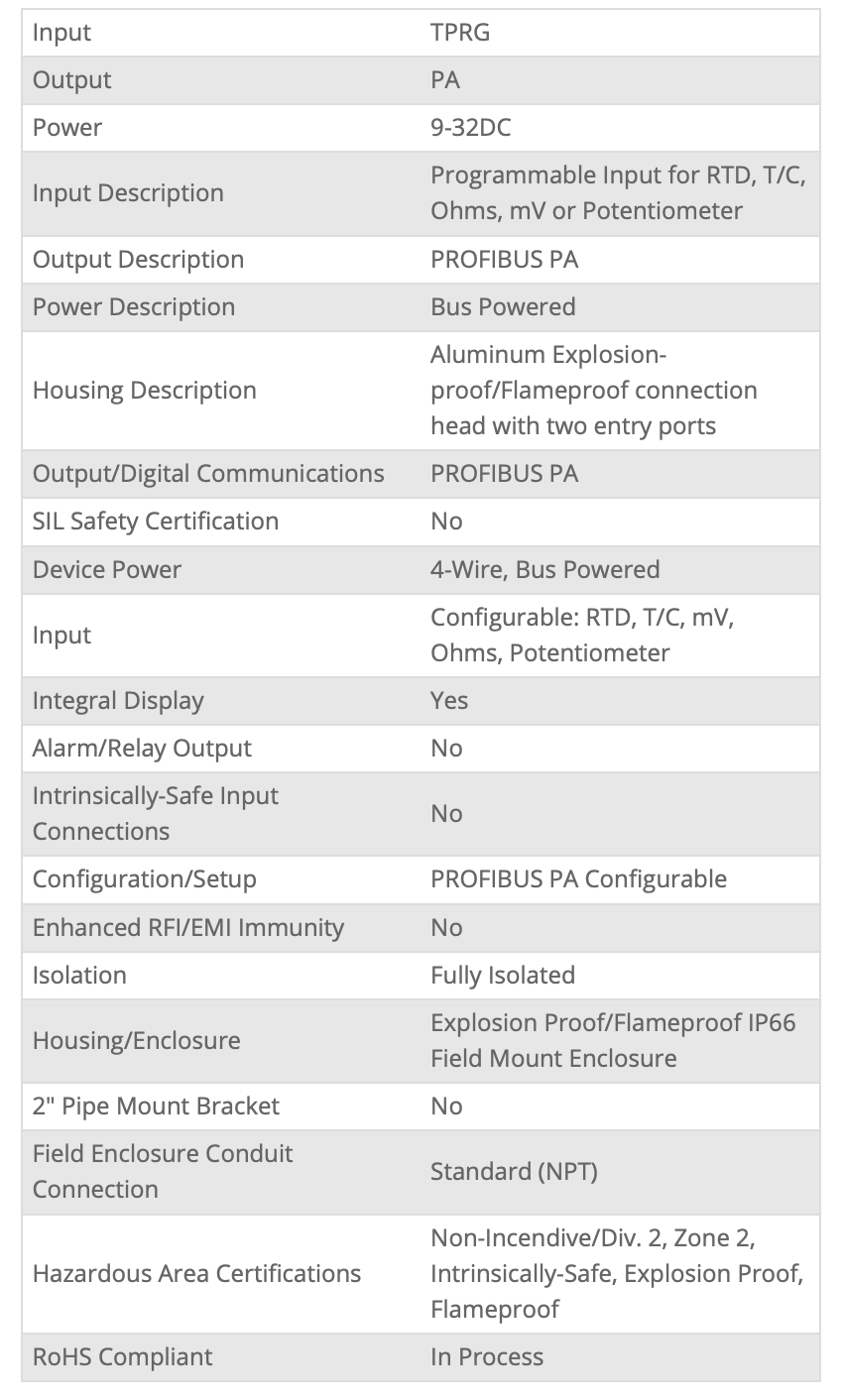 The TPZ Programmable PROFIBUS PA Temperature Transmitter saves wire and installation costs by allowing up to 32 field devices (126 with repeaters) to be networked onto one, low cost PROFIBUS PA segment.