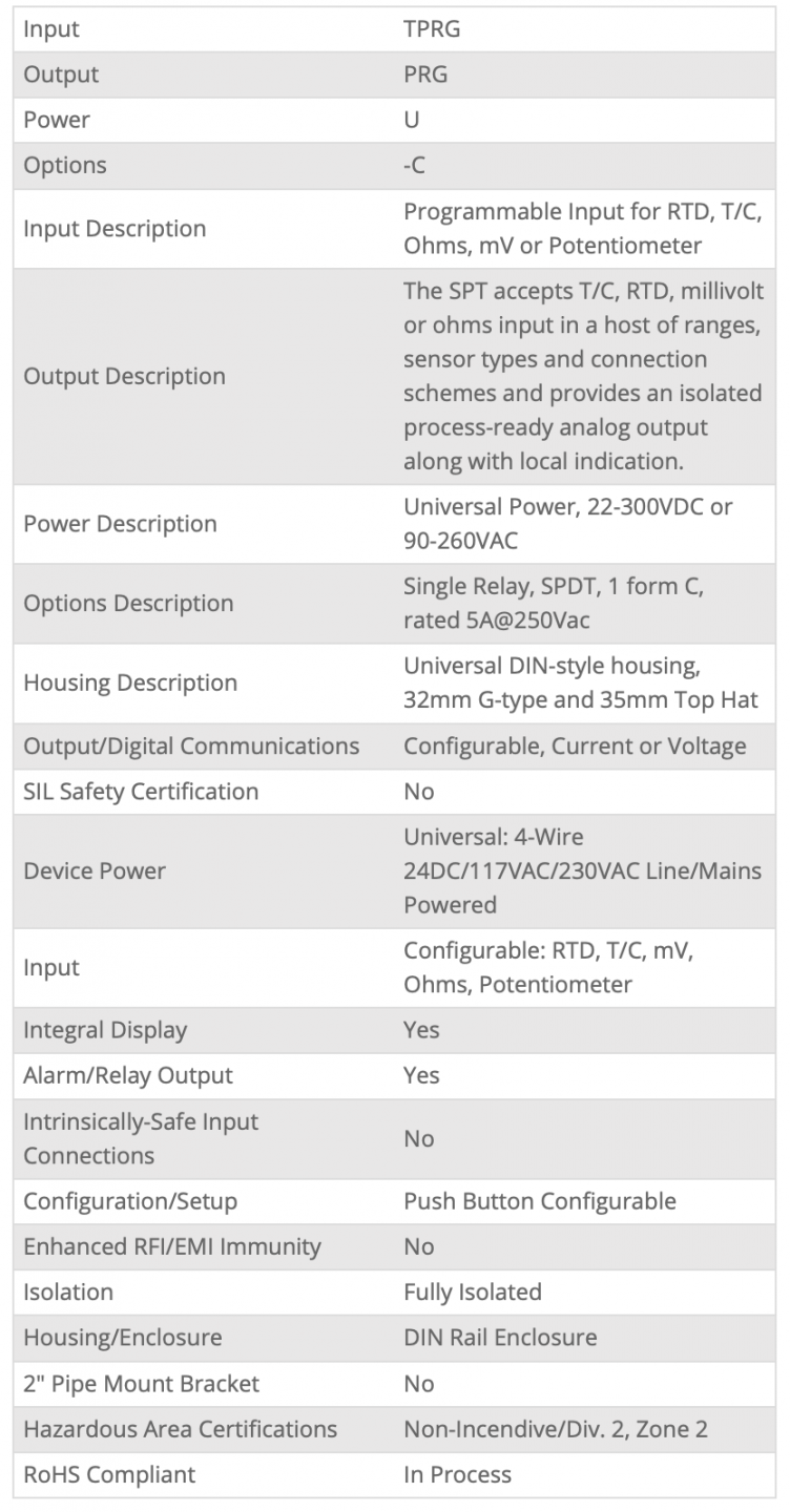 The SPT accepts T/C, RTD, millivolt or ohms input in a host of ranges, sensor types and connection schemes and provides an isolated process-ready analog output along with local indication.