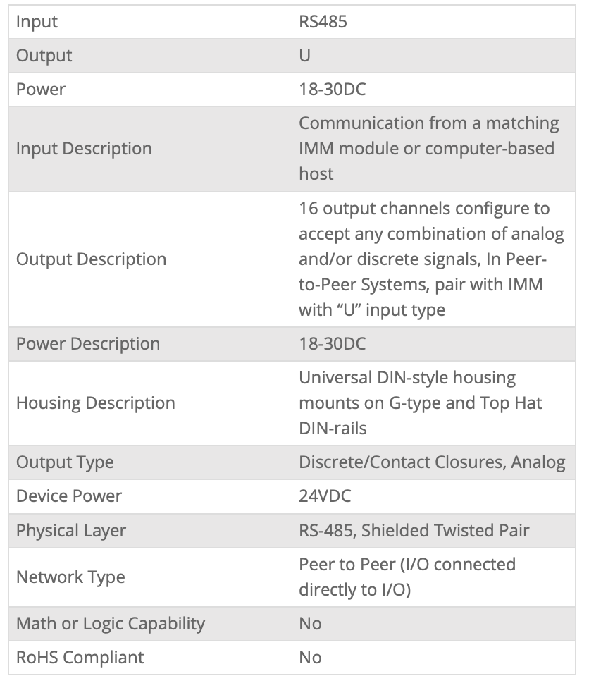 Each 16-channel OMM module accepts digitized data sent over the data link from a matching IMM or from a computer-based host. It “expands” the digitized data and outputs current, voltage, discrete, or relay signals.