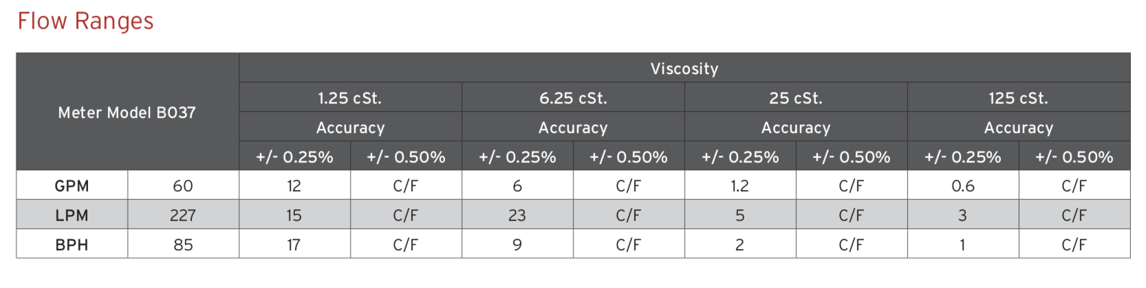 Materials of Construction:Meter Housing : Aluminum, SteelMeter Internals: Aluminum, Cast IronSeal Materials: Buna, Viton, TeflonBearing Material: Stainless SteelAccuracy: +/- 0.25% over 10:1 Flow RangeRepeatability: +/- 0.05% over 10:1 Flow Range