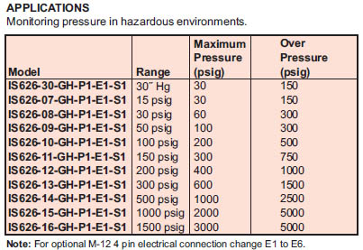 The Dwyer Series IS626 Intrinsically Safe Pressure Transmitters convert pressure into a standard 4-20 mA output signal. The Series IS626 can be used to accurately measure compatible gases and liquids compatible with its 316/316L Stainless Steel wetted parts. Series IS626 full scale accuracy is 0.25%. Designed for industrial environments with a NEMA 4X (IP66) housing, this transmitter resists most effects of shock and vibration. Models are available with a 3' cable or M-12 4 pin connection.